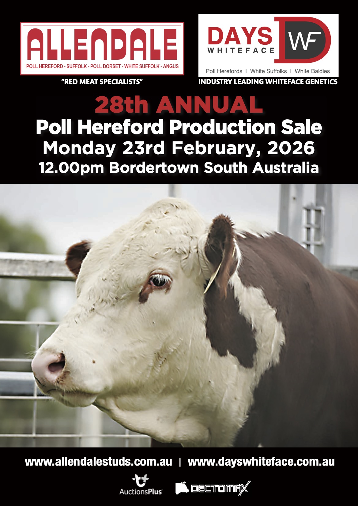Allendale Poll Herefords 28th Annual Production Sale in conjunction with Days Whiteface will be held on Monday 23rd February at 12pm (SA time) at “Dayswhiteface” Bordertown SA