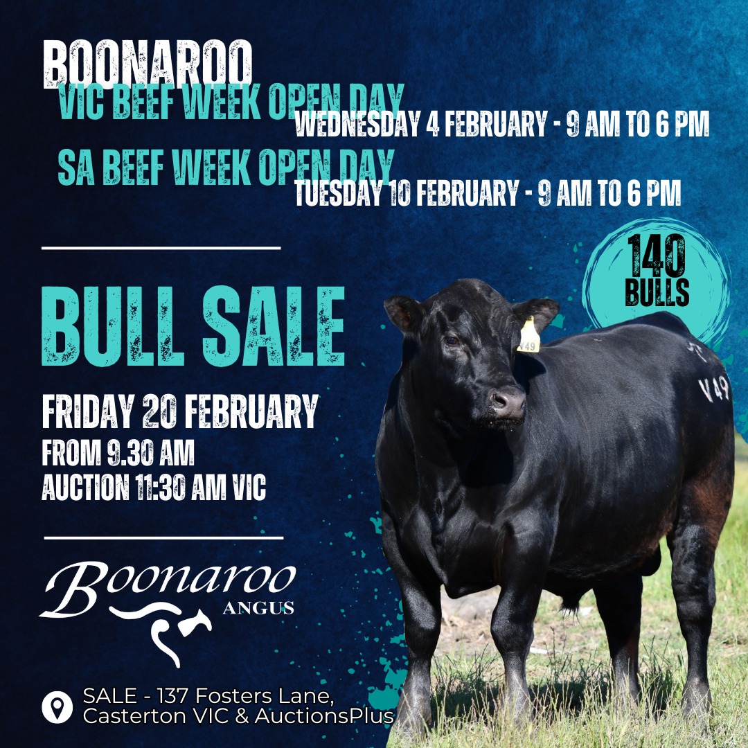 Friday Feb 20th at 11:30am (VIC time) on Property at “Boonaroo”, Corndale via Casterton, VIC Boonaroo will offer 134 Angus bulls