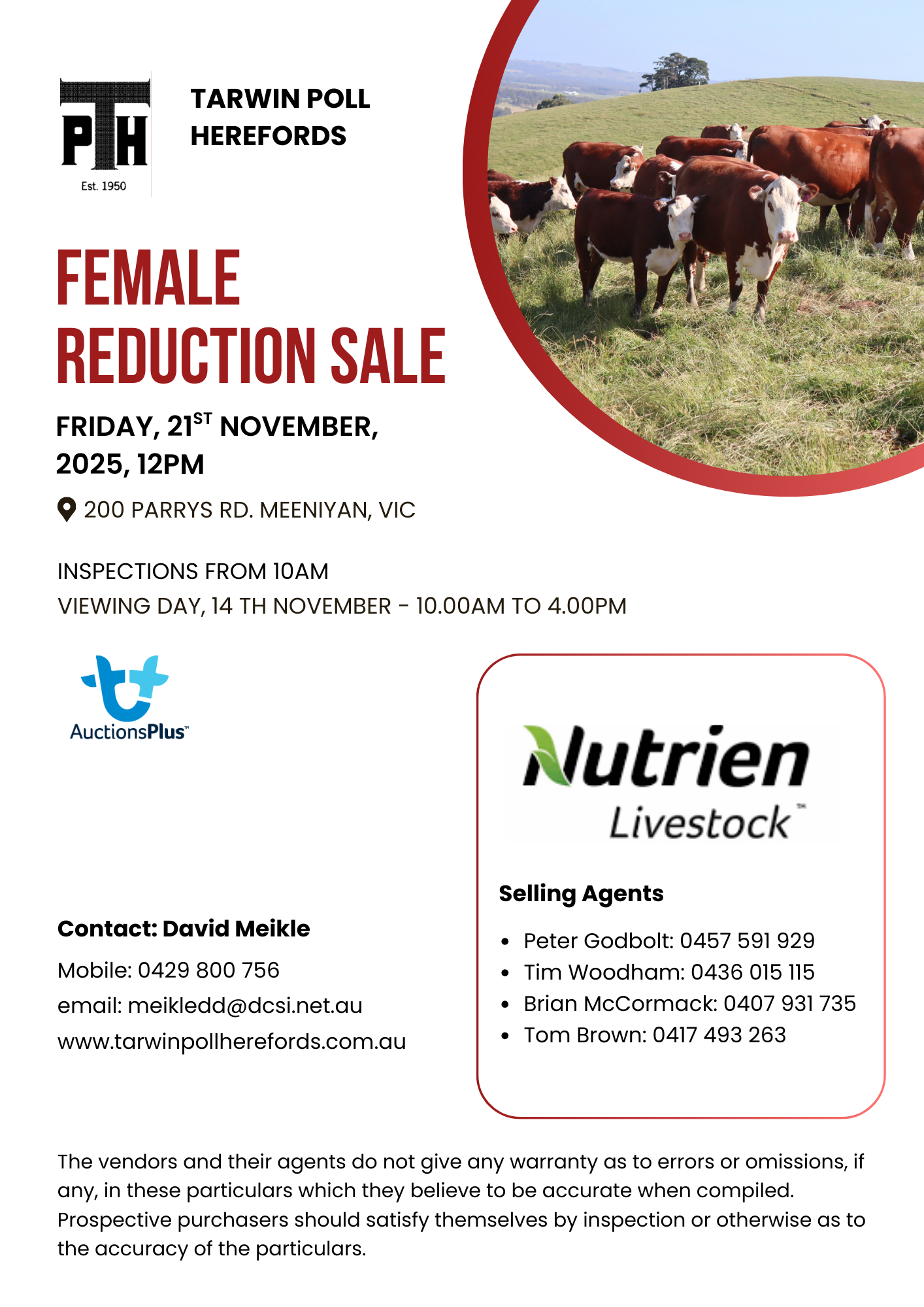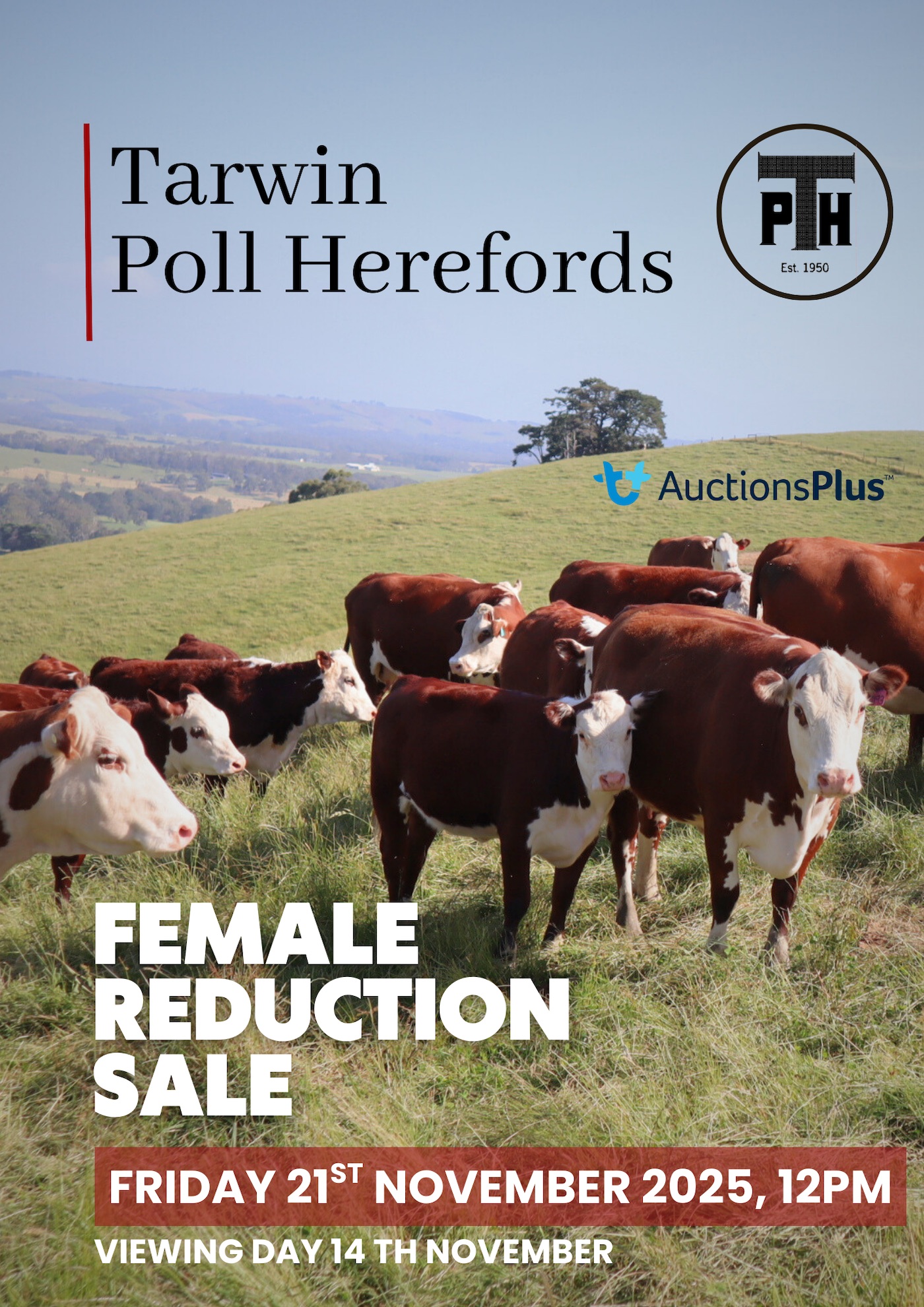 Tarwin Poll Herefords 2025 – Female Reduction Sale – Friday 21st November at 12pm on Property at 105 Parrys Rd, MEENIYAN VIC and ONLINE via AuctionsPlus