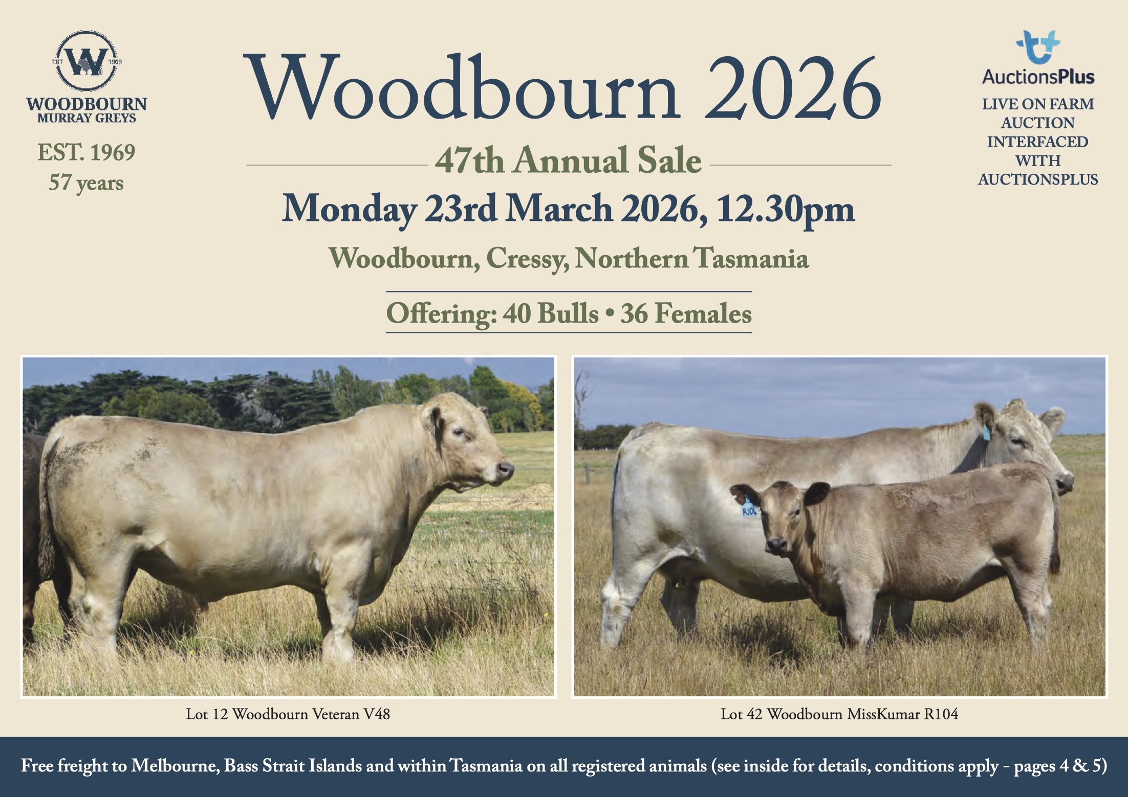The 46th Woodbourn Murray Grey Sale will be held on Monday 23rd March at 12.30pm at Woodbourn Sale Complex, Cressy, Northern Tasmania